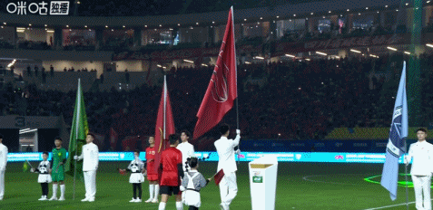 中超开幕式开始,首先是队旗入场环节