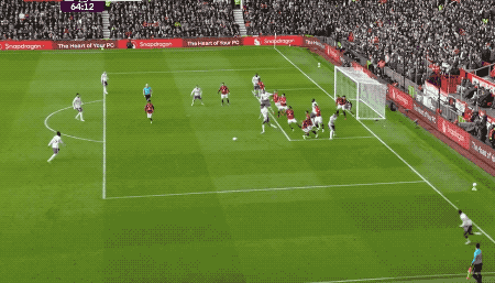 第53分钟,马丁内斯扑出姆伯莫的射门,曼联获得角球,B费主罚,卡塞米罗前点头球攻门,打破僵局。